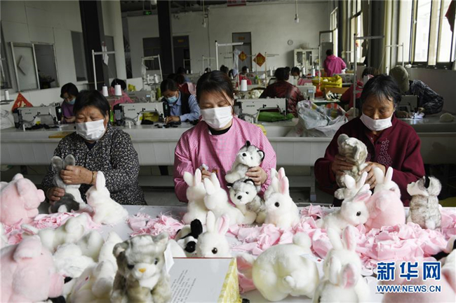 5月9日,在山东莒南县锦顺毛绒玩具厂,工人在制作玩具。新华社记者范长国摄