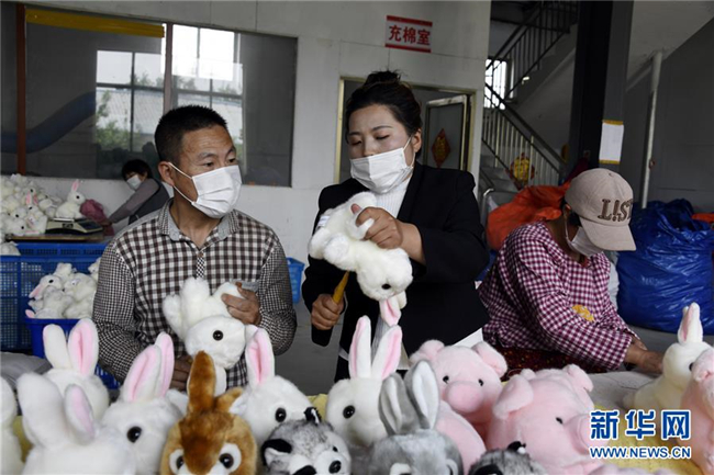 5月9日,在山东莒南县锦顺毛绒玩具厂,薄文芬(中)和丈夫研究如何提高玩具质量和出厂成品率。新华社记者范长国摄