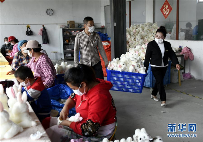 5月9日,在山东莒南县锦顺毛绒玩具厂,薄文芬(右)和丈夫搬运制作好的玩具。新华社记者范长国摄