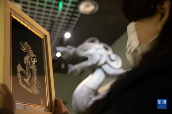 黑龙江省博物馆内展示的以铜坐龙为原型设计的鱼皮画(5月16日摄)。